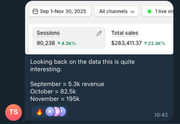Thomas came in knowing he wanted out of his job. September he hit $5.3k revenue. October he broke through to $82.5k. November he scaled to $195k. That's $283k in total sales and $87k in pure profit, built on a real brand, not a gimmick.